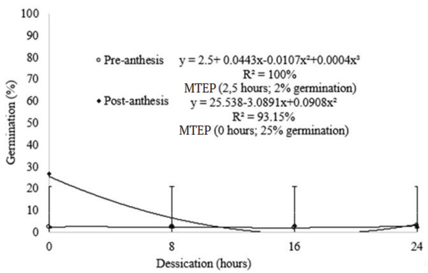 The adjusted regression equations were significant at 1% probability level by the t-test. Regarding the stage of floral development, the best germination percentages were observed in post-anthesis (25%), and when obtained in pre-anthesis the germination of the pollen was only 2%, proving unsuitable for collection (Figure 3).
