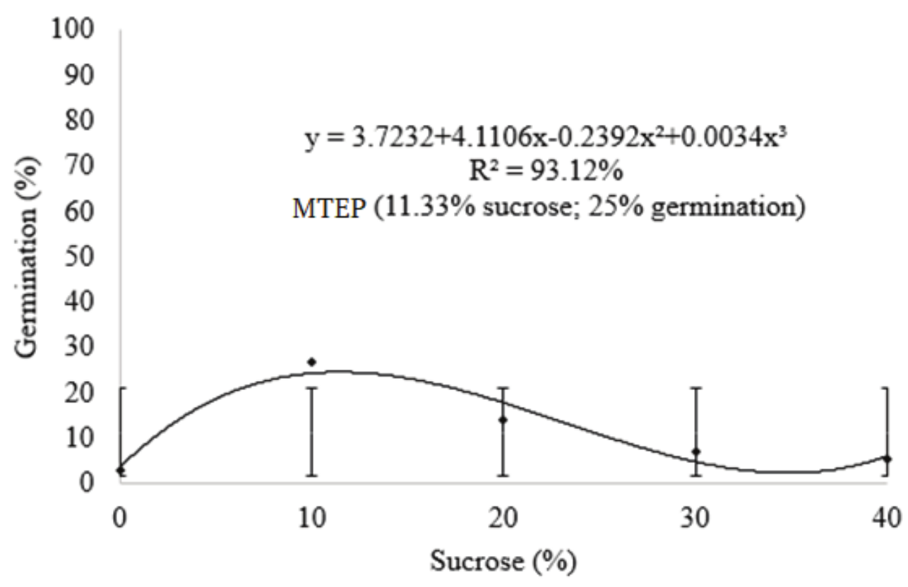 Subsequently, using fresh pollen grains from post-anthesis flowers, the effect of adding sucrose to the culture medium was verify. The sucrose factor has been shown to be significant, however, the germination percentage obtained can still be considered low, and according to the MTEP (maximum technical efficiency point), and it is possible to obtain 25% germination by adding approximately 11% sucrose to the culture medium (Figure 4).