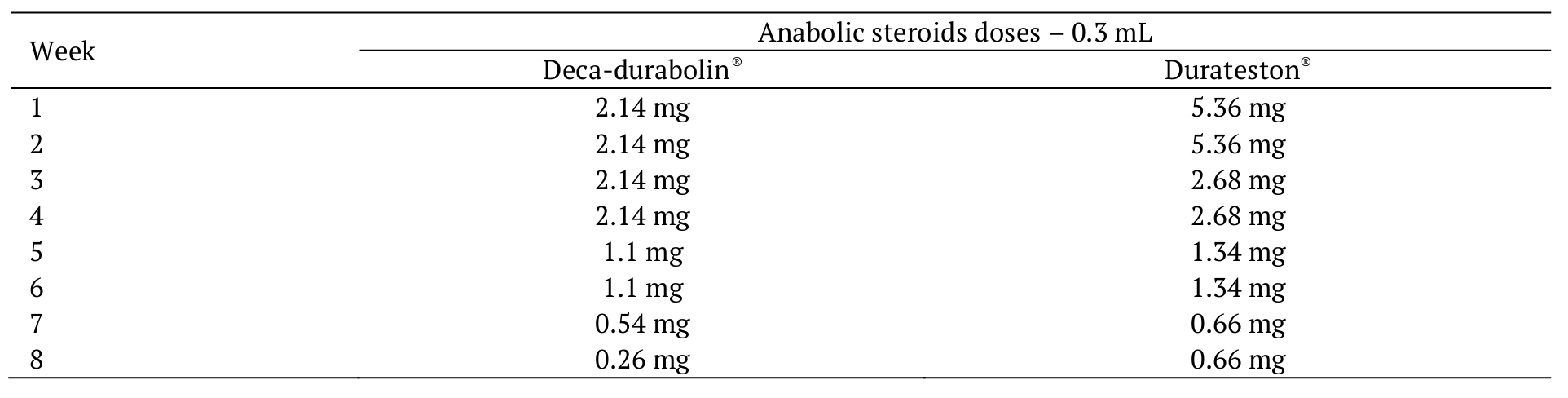 We carried out the experiments on four groups of 10 rats each, which were sixty days old and belonged to System Pathogen Free Program (Unochapecó Biotherium, Brazil). The animals had access to food and water ad libitum and were housed in single cages with a light and dark cycle of 12 hours each, at 22 ± 2°C. All experiments were accomplished following the Principles of Laboratory Animal Care and the Guidelines for the Care and Use of Mammals in Neuroscience and Behavioral Research. The protocols were approved by the Ethics Committee of the Contestado (Case 745/09) and complied with the requirements from the Federal Council of Veterinary Medicine. At the end of experiments, the animals’ euthanasia was performed adopting CO2 chamber protocol, according to Brazilian College of Animal Experimentation. The four groups were divided as follows: sedentary group plus ASC (SA), trained group plus ASC (TA), sedentary group plus vehicle (canola oil) (SV), and trained group plus vehicle (TV). ASC (testosterone decanoate, testosterone fenilpropionate, testosterone isocaproate, testosterone propionate - Durateston®; and nandrolone decanoate - Deca-durabolin®) used in this study is the same used by athletes (Neto, 2005), with some changes to adjust to the animals’ metabolism (Table 1). The administrations were performed in soleus muscle once week for eight weeks. The animals from TA and TV groups were submitted to three daily sessions of ten minutes each, with five minutes of interval between them. The swimming pool used had 1.8 m in diameter, 50 cm height and 38 cm depth, with water temperature at 30°C.