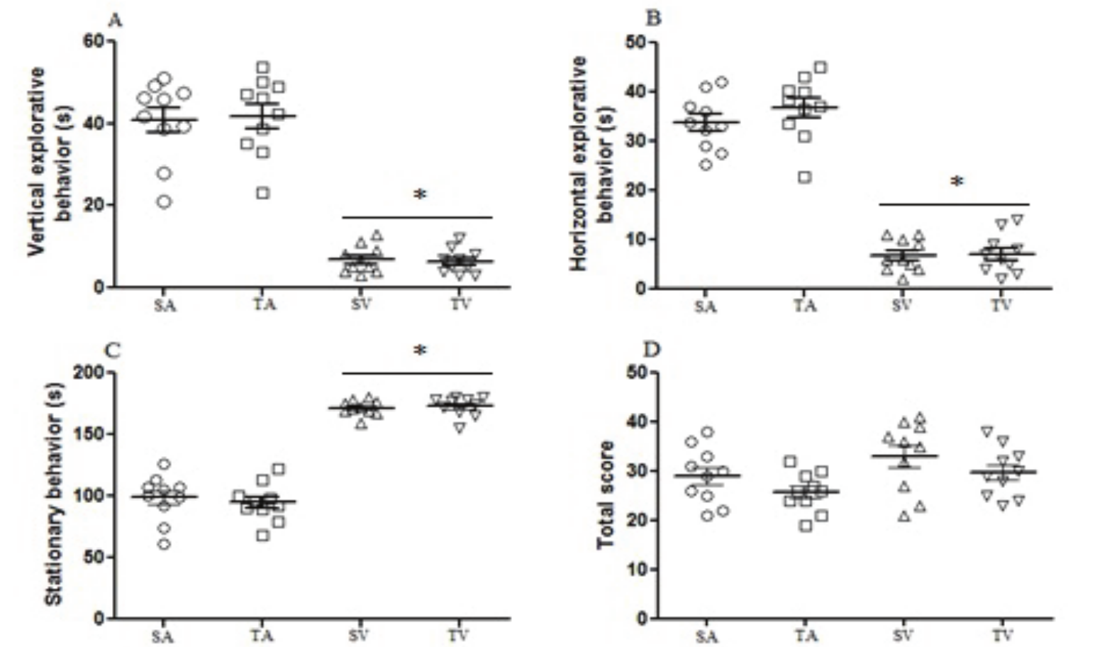At the test session of the PA, all animals from different groups did not step down from the platform throughout the session period. However, the groups that were treated with ASC (SA and TA) showed a better explorative behavior, both vertically (H = 29.4, p < 0.001) as horizontally (H = 29.7, p < 0.001), when compared to the groups without ASC treatment (Figure 2. A, B). Furthermore, both groups SV and TV showed a higher stationary behavior on the platform than the groups SA and TA (H = 29.7, p < 0.001). The sum of score (jumping, vocalization, flinching, and no response) was performed throughout the training session and there was no difference between groups, that is, all individuals were subjected to same stimulus and showed similar behaviors (Figure 2. D).