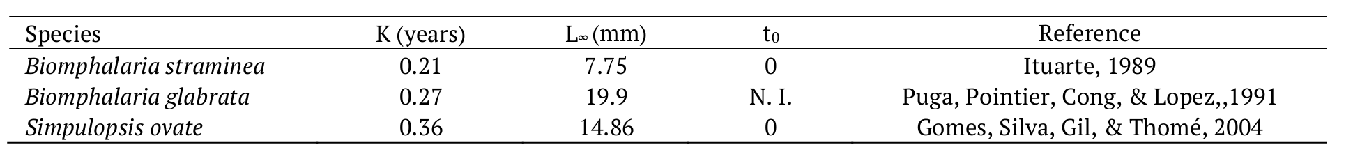 The high growth rate of M. tuberculata registered in the present study, corroborated the potential of invasive species. Elkarmi and Ismail (2007) also recorded rapid growth for the species in the Arabian Peninsula, with K = 0.245, L∞ = 28 mm and t0 =0.837. Here, we verified that the highest growth occurs in the first year, reaching about 21 mm, similar to Supian and Ikhwanuddin (2002) that observed, maximum value of length of 25 mm in Sabah, Borneo for the first year of life. Due to this highly rapid growth, the species may have advantages over other mollusks, a striking characteristic observed in invasive species (Santos et al., 2012). This pattern of growth was also verified in some terrestrial gastropods (for this statement see Table 2). When compared to other invasive species, growth rates were similar, as C. fluminea (Müller, 1774) that had K = 0.65, L∞ = 32 mm and t0= 0.5 (Cataldo & Boltovskoy, 1999).