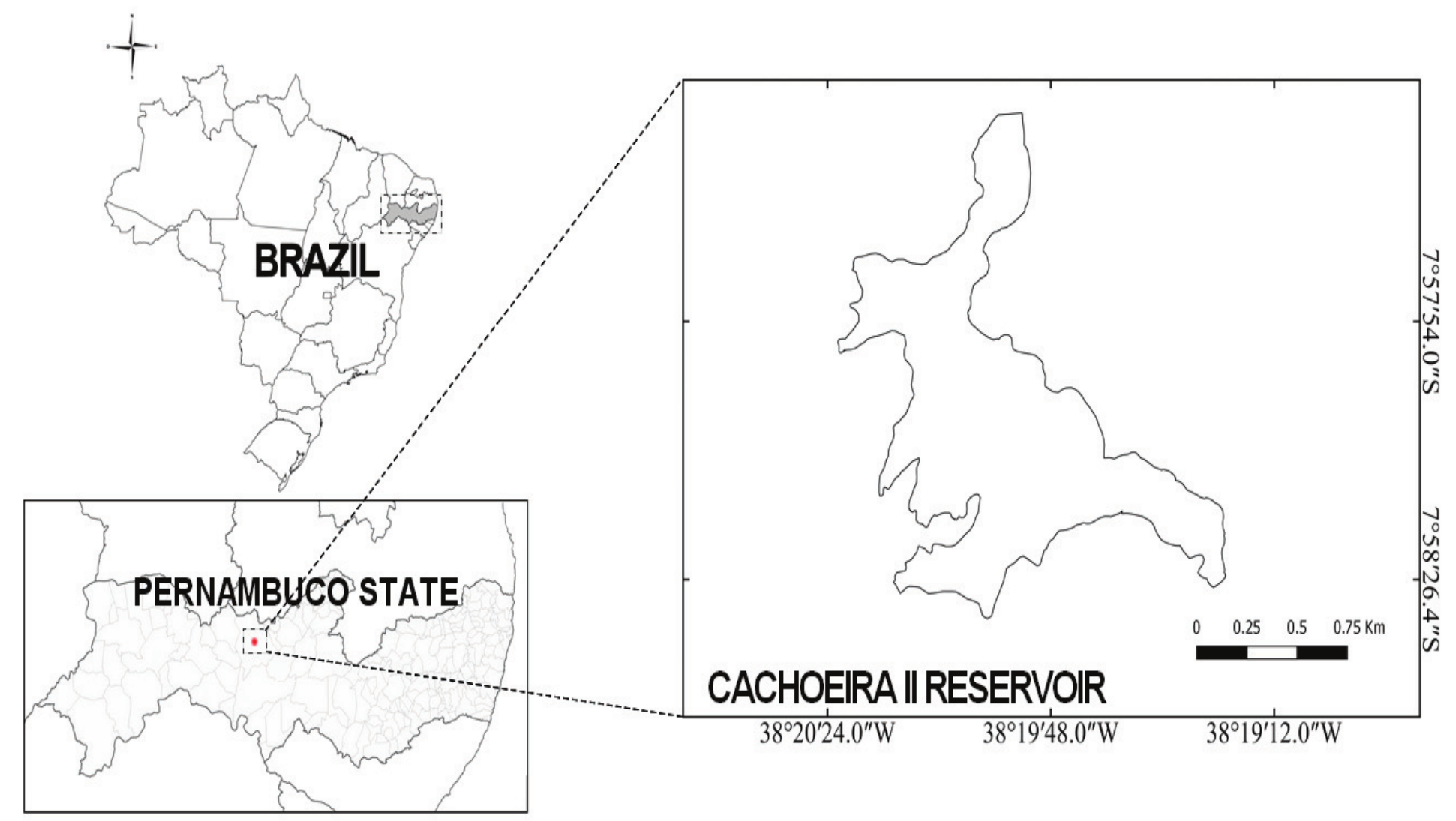 The collections were carried out between August and November 2016 at the Cachoeira II reservoir, located in Serra Talhada, Pernambuco state, Brazil (Figure 1). This reservoir is an important source of drinking water supply and income, for artisanal fishermen, for this region. Although it has 21,031,000 m³ of water capacity, an extreme drought season has been gradually affected the volume of water of this body (Oliveira, Oliveira, Almeida, Gálvez, & Dantas, 2019).