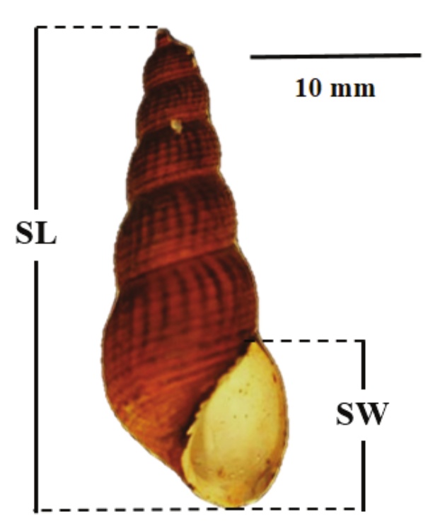 Each captured specimen was identified according to Fernandez, Santos, Miyahira, Gonçalves, Ximenes, and Thiengo (2012) and the shell length (SL) and opening width (SW) were measured with analog caliper (0.05 mm) (Figure 2). Then, it was then identified whether the shell was empty or occupied, through presence or absence of operculum and soft mass. The t-student test was performed to compare the lengths per month to verify if there was a significant difference between months (Zar, 2009). In addition, the proportion of empty and full shells sampled by site and collection months was verified.