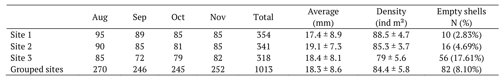 A total of 1,013 snails were collected, with shells varying from 7 to 39 mm SL, the mean total density was 84.42 ± 3.86 individuals m-2 (Table 1). The place with the largest amount of mollusk was the soft bottom substrate with the macrophytes presence in the four months sampled, followed by the soft bottom environment. However, there was no difference between sites (p-value = 0.673). Regarding the number of empty shells, the highest account was for the rocky environment, with average 17.56%, while the lowest account was for the soft bottom with macrophytes presence with only 2.82%