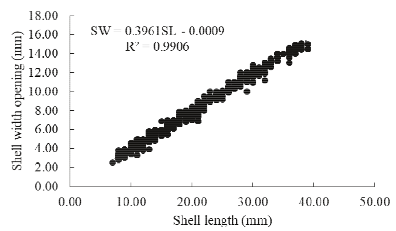 The SL vs. SW relationship was negative allometric, showing that the length of the shell increases faster with which shell opening. Other studies also find close values such as Chagas, Barros, and Bezerra (2018) that verified a negative allometric relation of b = 0.26. This relationship may be linked to the degree of establishment of the species in the environment, since when well established, it can reduce or even eliminate other species of the same trophic level (Ricciardi & Simberloff, 2009), thus possessing space and food without competition and growing more rapidly.