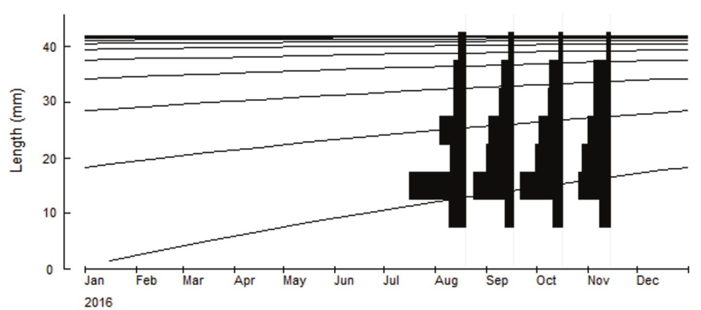 The mean estimated age for M. tuberculata in the present study was 0.95 years, with a minimum age of 0.1 and a maximum of 4.45 years (53.4 months). The maximum theoretical estimated age was 11 years, assuming that the maximum length that the species could reach is 42 mm.