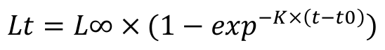 The growth parameters of the Von Bertalanffy (1938) curve were estimated to complete (Equation 1):