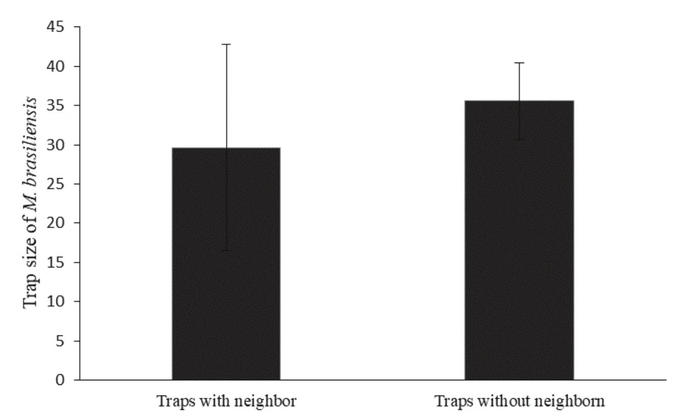 With the increase in trap size, which reflects the progression of larval instars, M. brasiliensis larvae were observed outside of groups (no presence of neighboring larvae within a 30-cm radius). Larvae that remain in groups are subject to competition for prey items, the destruction of their traps by neighboring larvae and cannibalism (Gotelli, 1993; Day & Zalucki, 2000; Lima, 2016). Isolated larvae avoid these problems, but at the cost of moving to a different location and reconstructing the trap (Lucas 1985; Lima & Silva, 2017). Thus, there must be a competitive advantage for larger larvae to forage farther from other M. brasiliensis larvae. For example, ants, which are the main food source for antlion larvae, avoid foraging near trap sites (Hollis, 2016). Thus, the relocation far from groups may minimize the effects of competition and maximize the capture of prey items.