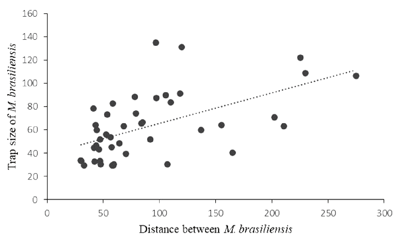 The mean distance between the grouped M. brasiliensis larvae was 90.16 ± 60.24 mm. The high standard deviation demonstrates that some larvae were very close to one another (minimum distance: 29.93 mm), and others were quite distant from one another (maximum distance: 275 mm). The relationship between the sum of the trap diameters and the distance between neighboring larvae demonstrated greater distance between larger neighboring larvae (r2 = 0.26; p = 0.0007; n = 44) (Figure 2).