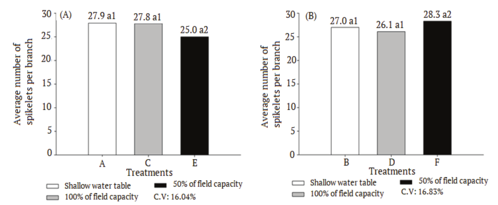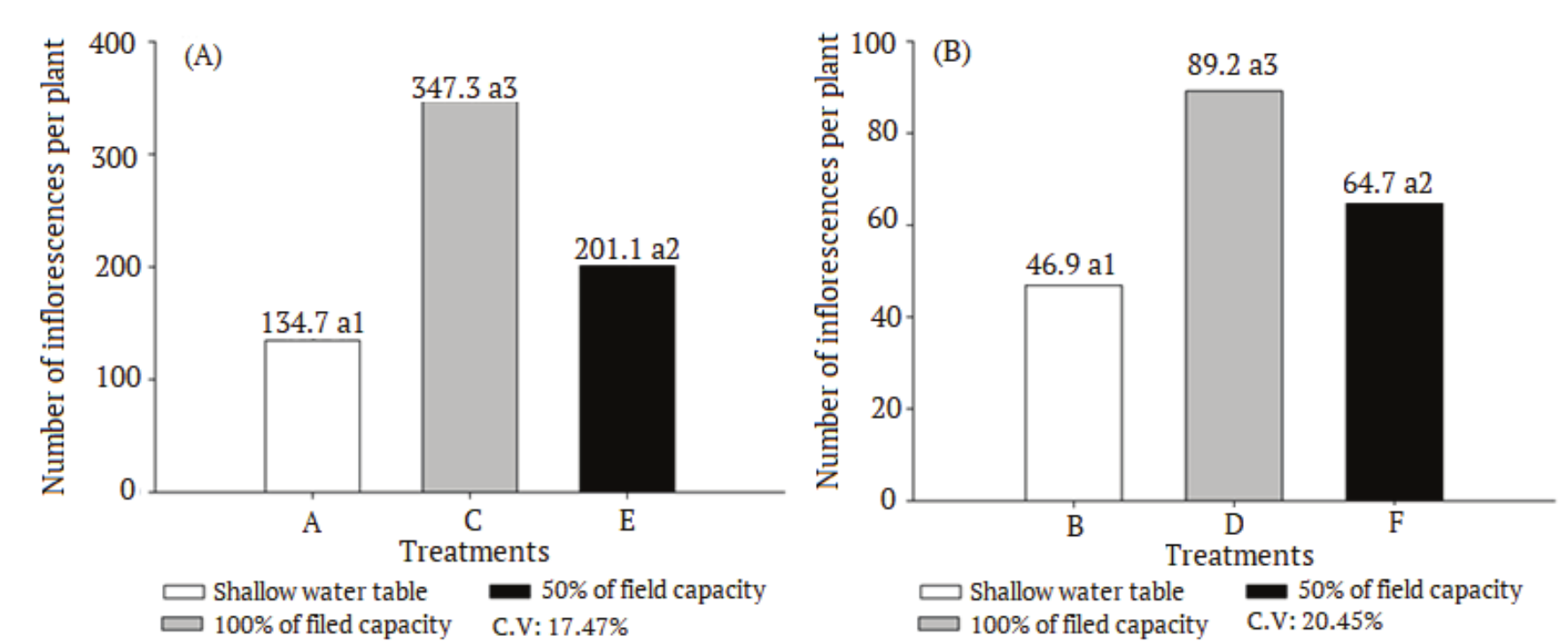 The two species showed similar behavior in relation to the emission of inflorescences. In the treatment where the soil was maintained with a shallow water table, induced plants to produce inflorescences before the other treatments, thus shortening the vegetative period for both species (Figure 2).