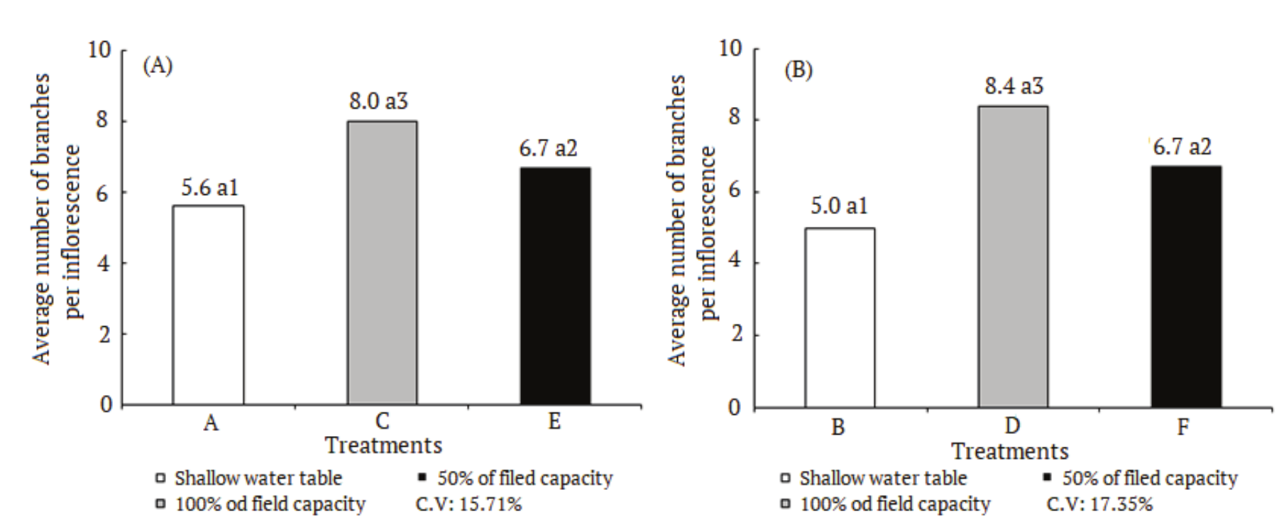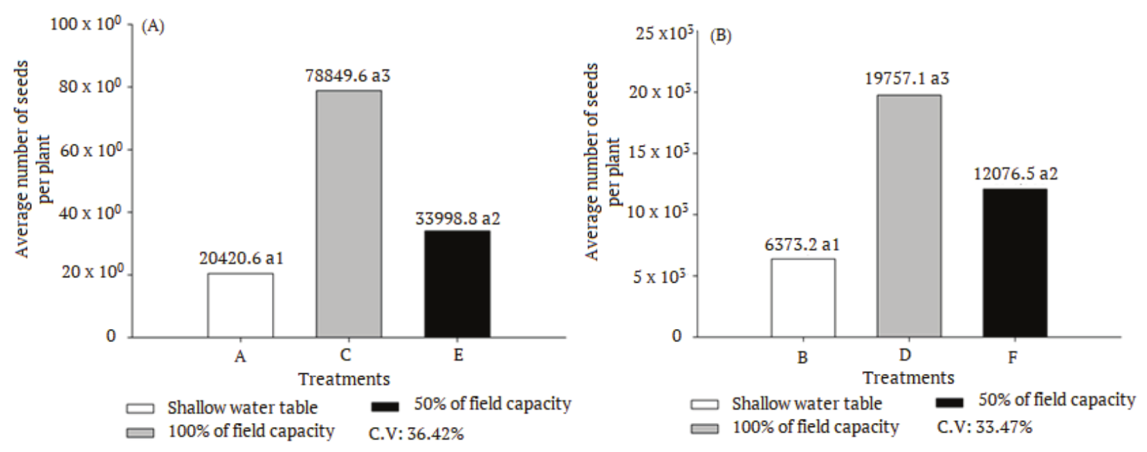 Other parameters that have been affected by increasing soil moisture, for both U. plantaginea and U. platyphylla, were the number of inflorescences per plant (Figure 4), average number of branches per inflorescence (Figure 5) and number of seeds per plant (Figure 7). It can be seen that as the amount of water added to the soil increased, with greater negative effect on the shallow water table condition, there was a reduction in the number of inflorescences per plant as well as a reduction in the number of branches per inflorescence. The number of spikelets per branch varies by species. U. plantaginea presented a reduction when submitted to a 50% of field capacity. However, U. platyphylla showed an increase when submitted to the same water condition (Figure 6). The number of seeds per plant was higher when the species were submitted to a condition of 100% of field capacity, being higher in 43% and 61% for Urochloa plantaginea and Urochloa platyphylla, respectively, when compared to 50% of field capacity (Figure7).