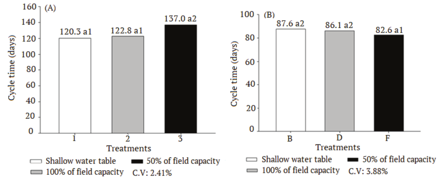 In the U. plantaginea, the cycle time was 5-7 days shorter in the conditions of higher amount of water in the soil (shallow water table and 100% of field capacity) in relation to the conditions of lower availability of water (50% of field capacity) (Figure 2A).