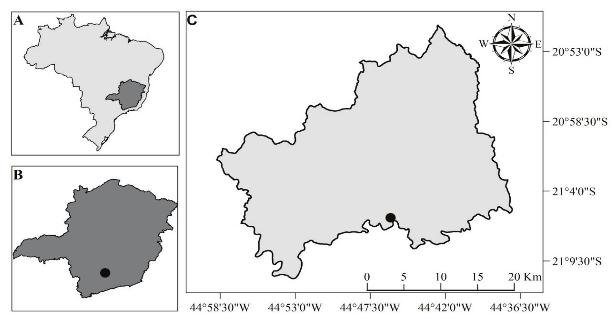 We conducted this study in Minas Gerais State, Bom Sucesso municipality in an area known as Morro das Almas, located between the coordinates 21º 01' 58" South and longitude 44º 45' 28" West, in an altitude of 952 m above the sea level. The region presents a mosaic of phytophysiognomies, since the Minas Gerais State is an ecotone area (transitional areas between phytophysiognomies) Instituto Brasileiro de Geografia e Estatística (IBGE, 2012) with the main vegetation types belonging to the Cerrado (Brazilian savannah) and Mata Atlântica Domain IBGE (2013). Climate in the region is usually marked by two well defined seasons - wet and rainy summers, with dry cold winters IBGE (2013). The mean annual precipitation is 1776 mm concentrated in the months of October to March and mean temperature of 19ºC (Figure 1). The area was previously studied by the Departamento de Ciências do Solo (Department of Soil Science) from Universidade Federal de Lavras, where they investigated the geology of the area and found that the flora from that locality stands upon soils holding high saturation of iron oxide (Fe2O3 on 72.33%), characterizing serpentine soils Araujo, Pedroso, Amaral, and Zinn (2014). Local landscape is surrounded by natural fields - a mosaic of Altitude and rocky fields), in which is usual the presence of livestock grazing.