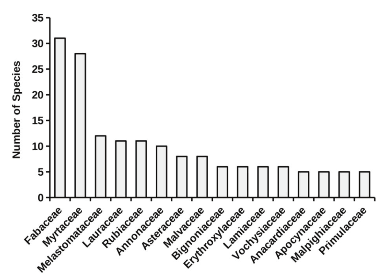 We recorded 249 arboreal species, located in 61 botanical families (Table 1). The most representative family in this study was Fabaceae, holding 31 species, an equivalent to 12.60% of the total richness in the community, followed by Myrtaceae with 33 species (11.38%) and Melastomataceae with 12 species (4.87%) (Figure 2). Those families hold 10.37% of the total floristic richness. Copaifera L. and Bowdichia Kunth were the most representative genera in Fabaceae, followed by Myrcia and Eugenia in Myrtaceae and Miconia and Tibouchina in Melastomataceae. Myrcia splendens, Pera glabrata and Ocotea pulchella were commonly found in all the area.