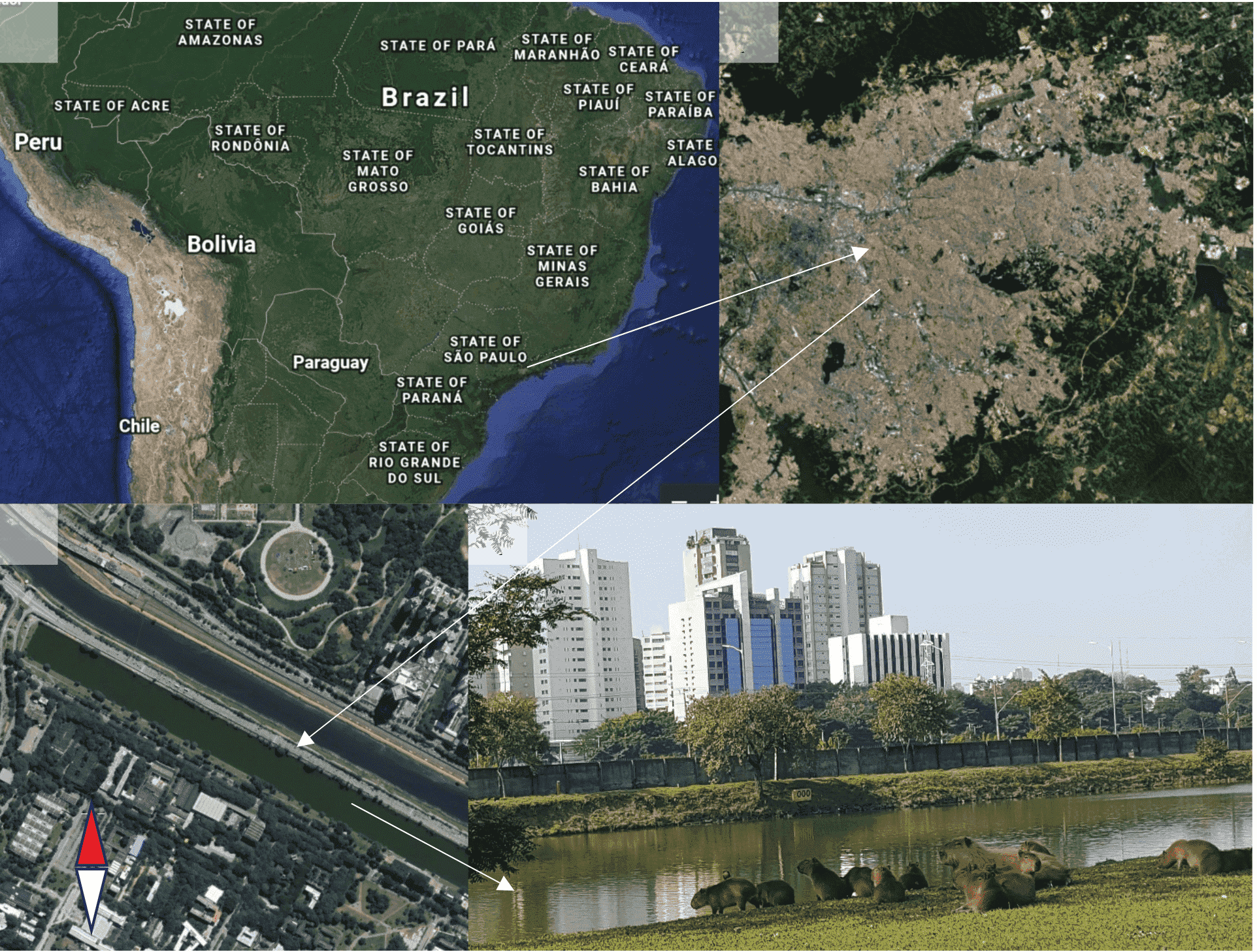 The study was conducted year-round, during wet and dry seasons (December 2016 to January 2019) at the Raia Olimpica, a large man-made pool (Figure 2b) on the campus of University City, Universidade de São Paulo, Brazil. 23º 33’ 21 S 46º 43’ 14 W, altitude 722 m (WGS84 EGM96 Geoid. Google Earth Satellite Imagery, 2019). The pool area is approximately 247 500 m2, surrounded by trees and extended grass areas, in the midst of one of the world’s largest megalopolises (Figure 2). The Pinheiros river, the principal corridor for capybara migration, one of two rivers partially surrounding the City, is separated by an intercity highway. The city of São Paulo lies within the Atlantic Forest domains of the São Paulo State. Peak temperatures in the summer months (December - March) reach 30ºC, with an average temperature of 25ºC and median rainfall of 170 mm. In the winter (June - September), temperatures can fall to below 12ºC, with an average temperature of 19ºC and median rainfall of ≤ 50 mm (World Meteorological Organization, 2019).