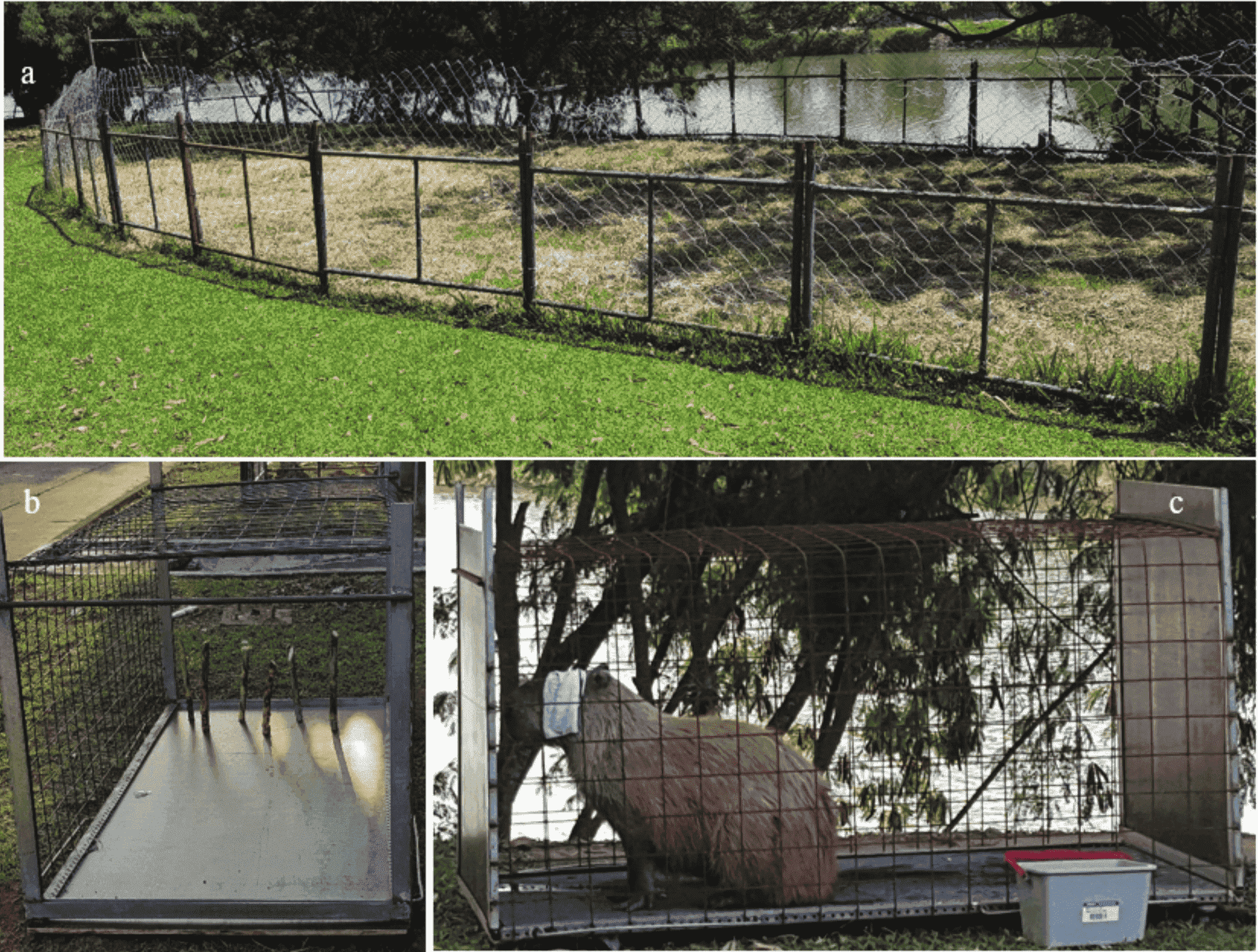 For group confinement, we constructed a budget-friendly flexible corral (Figure 3a) using a scaffold frame (ea. element L: 150 x H: 100 cm). The leg extensions were forced into the ground and connected to one another using a metal wire (gauge 14). A continuous metal fence was then installed from the inside (1.5 x 45 m in circumference, ± 127 m2), fixed to each scaffold frame using the same metal wire. The top portion of the fence was curved inward and maintained in position by tightening the upper portion of the fence every three to four m with metal wire. The aim of the fence’s flexibility was to impede any push-throughs or possible jump or scaling escapes. Capture strategies for individual capybaras, namely satellite males, were twofold: (a) employ classical conditioning methods to lure the male into the corral, or (b) alternatively, use specially-constructed single-animal traps.