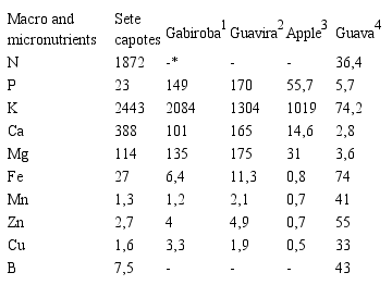 The quantification of the macro and micronutrients evaluated in sete capotes in this study, as well as the levels observed in fruits of some Myrtaceae, compared to the data obtained in the seven layers, are displayed in Table 1.