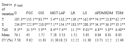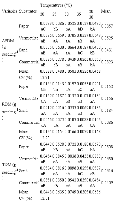 The highest values for aerial part dry mass (APDM) were obtained when seeds were submitted to constant temperatures of 25 and 30°C with vermiculite or sand as a substrate, and with alternating temperatures with vermiculite substrate (Table 5). The highest values for root dry mass (RDM) were obtained with sand at 20, 25 and 30°C, vermiculite at 25 and 20-30°C, and paper at 30 and 20-30°C (Table 5). The highest values for total dry mass (TDM) were recorded at constant temperatures of 25 and 30°C in sand and vermiculite, and with alternating temperatures with vermiculite (Table 5).