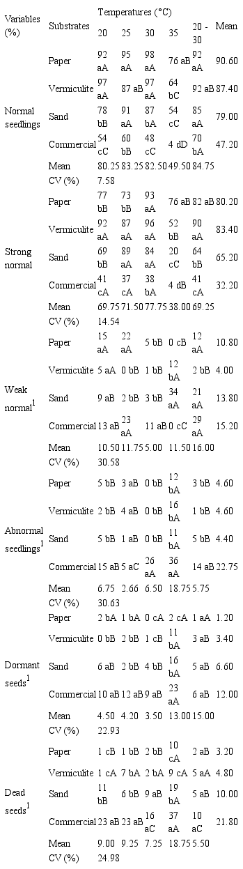 Data for normal seedlings, abnormal seedlings, dormant seeds and dead seeds were transformed as and submitted to analysis of variance, with the means being grouped by the Scott-Knott test. Means of the original non-transformed data are presented.