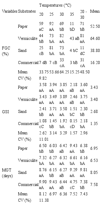 The experimental design was completely randomized with treatments distributed in a 5 x 4 factorial scheme with four replicates of 25 seeds each. The treatments comprised five temperature regimes (constant 20, 25, 30, 35°C and alternating 20-30°C, with photoperiod of 8 hours) and four substrates [blotting paper, vermiculite, sand and commercial substrate (Bioplant®)].