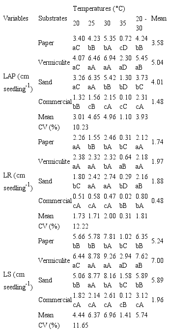 The highest mean length of the aerial part (LAP) of seedlings was observed for vermiculite at constant temperatures of 25 and 30°C, and for sand at 25°C (Table 4). Azevedo, Bruno, Gonçalves, and Quirino (2010) also found vermiculite and sand at temperatures of 30 and 20-30°C to produce the greatest seedling length for Crescentia cujeteL.