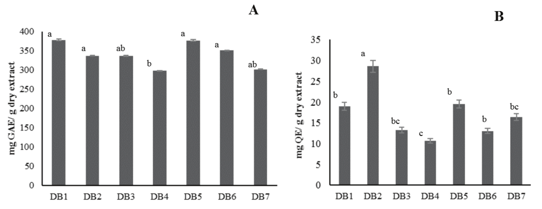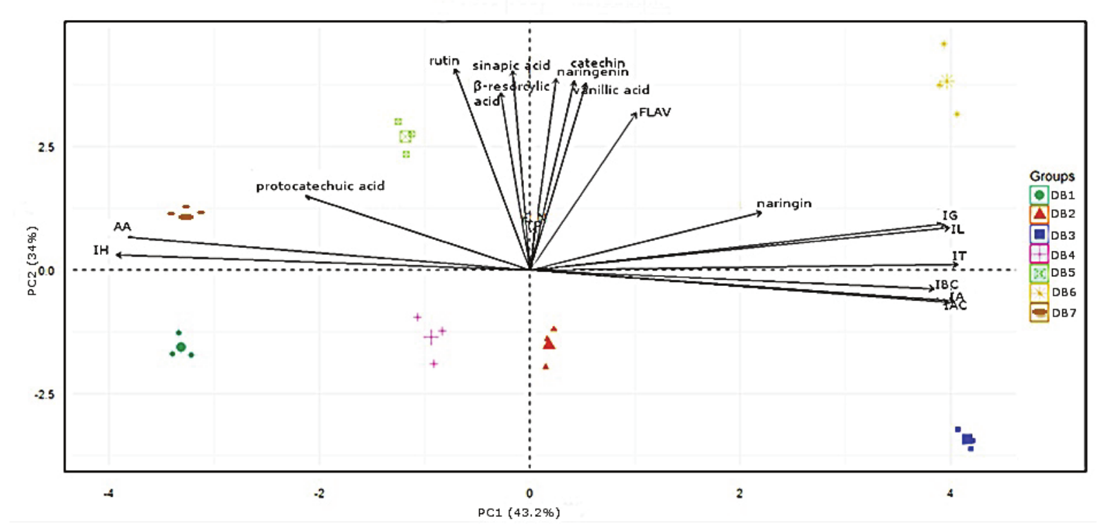 A principal components analysis (PCA) was also performed in the present study (Figure 3). The data of hydroalcoholic extracts was used to visualize the variation in component contents and enzyme inhibitory activities of the samples. This multivariate analysis method enables the reduction of the information from a large number of variables to a small number of principal components, and thus determining the similarity between them and contributing to a better interpretation of the data (Jolliffe & Cadima, 2016). The first component (PC1) was strongly represented by chemical component contents, while the second component (PC2) was associated with enzyme inhibitory activities. The seven groups formed representing the samples characterized by chemical component contents and biological properties. The samples DB5, DB6, and DB7 were distinctly characterized by positive values of PC2, while the other by negative values. The negative side of PC1 contains the samples DB1, DB4, DB5, and DB7 while the positive side characterizes the rest of the samples.
