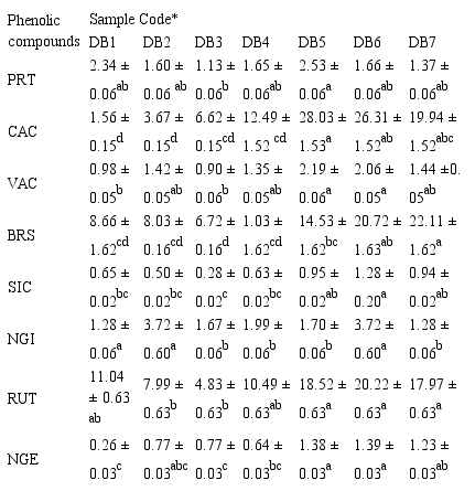 The identification and quantification of phenolic compounds in D. ecastaphyllum hydroalcoholic extracts were performed by HPLC-PDA analysis (Table 1). According to the reported results, it was possible to identify different hydroxybenzoic acid derivatives as protocatechuic, vanillic and β-resorcylic acids, whose last compounds were the main contributors for analysis. Sinapic acid, a hydroxycinnamic acid derivative, was also identified and quantified in all samples, the content was ranging from 0.28 ± 0.02 to 1.28 ± 0.20 mg L-1. Concerning the flavonoid family, it was possible to quantify four compounds, namely catechin, rutin, and the flavanones naringin and naringenin. From the previously mentioned compound, catechin and rutin were the main contributors to the phenolic composition. It is observed a trend with samples DB5, DB6 and DB7 presenting the highest content of the phenolic compounds quantified.