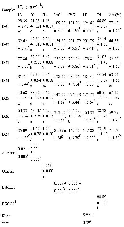 For the α-amylase inhibitory activity, DB1 and DB7 samples were the most efficient with IC50 values of 28.35 ± 2.40 and 25.09 ± 1.33 μg mL-1, respectively. For the α-glucosidase inhibitory activity, the IC50 values ranged from 21.56 ± 0.78 to 68.37 ± 2.75 μg mL-1. Fei et al. (2014) investigated the inhibitory effects and possible mechanisms of Oolong tea polyphenols, specifically (−)-epigallocatechin gallate (EGCG) and (−)-epigallocatechin 3-O-(3-O-methyl) gallate (EGCG3″Me) on pancreatic α-amylase concluding that the inhibitory effects against α-amylase could be related to the cooperative effects of hydrophobic association and hydrogen bond formation between polyphenols and α-amylase.