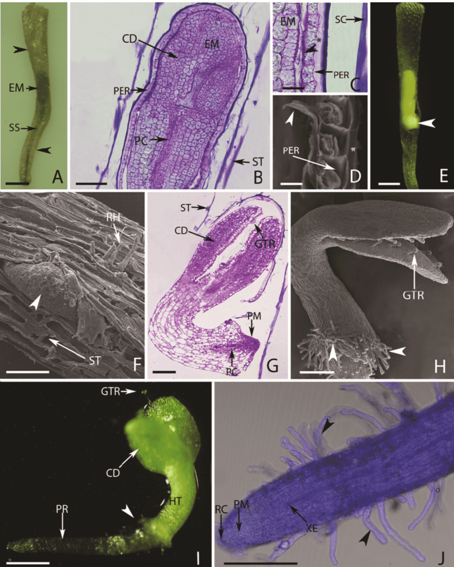 This genetic resource has significant value, yet, little is known about its initial development. Therefore, it is necessary to advance in basic scientific understanding of this critical initial development stage of parasitic plant. Therefore, based on analyses with light, confocal and electron microscopy, the present study aimed to characterize the post-seminal structure and development of the hemiparasitic E. grandiflora, during the establishment of parasitism on the Pennisetum purpureum roots; in order to identify aspects that might influence the survival of initial development for parasitic seedlings and plants.