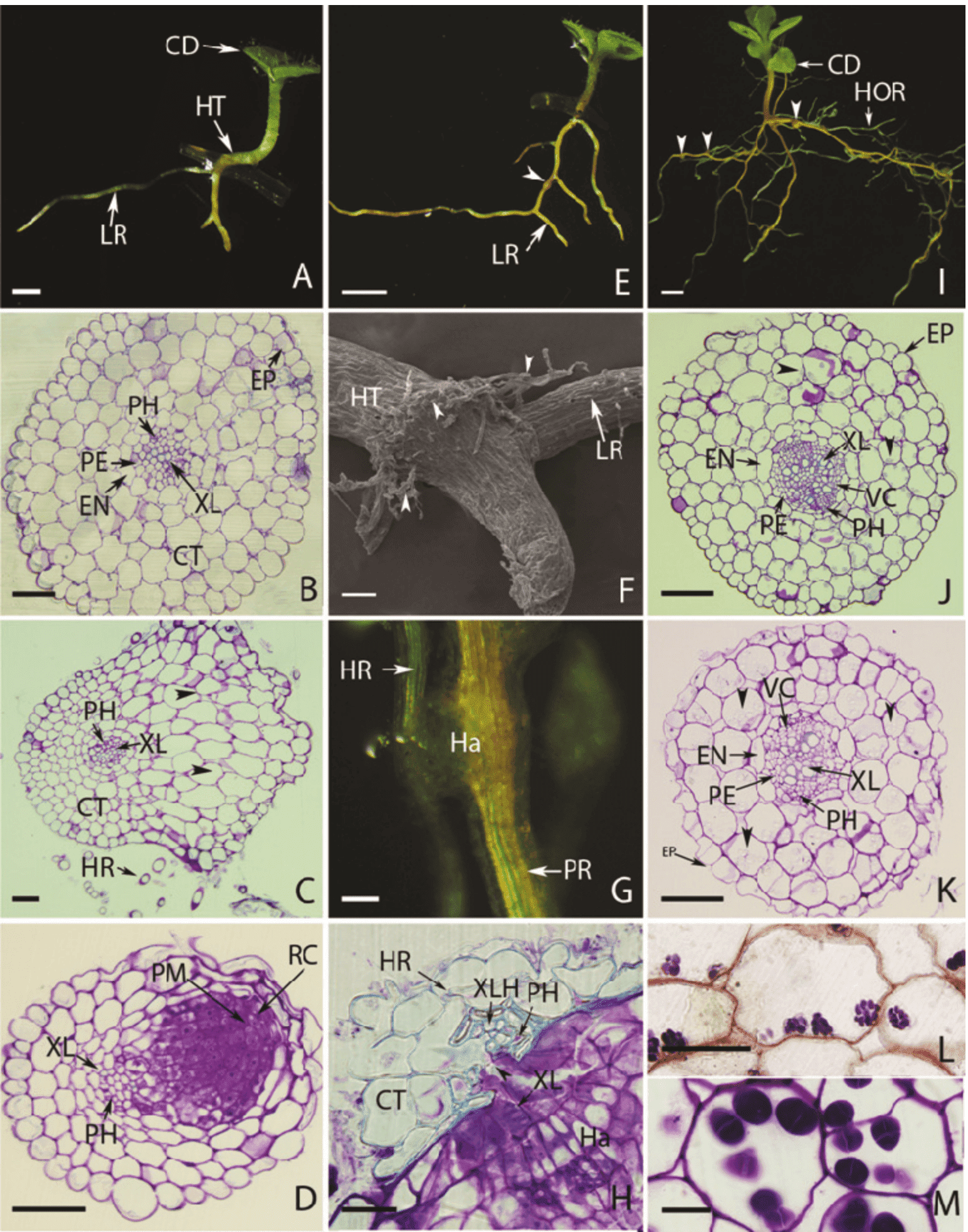 On day 64 after radicle emergence, the parasitic root system grew faster with more ramification compared to previous developmental stages and more haustoria attached to host root. Roots, mainly older, showed strong orange pigmentation (Figure 2I). As shown in Figure 2J-K, we saw evidence of vascular cambium cells, even though no evidence of secondary xylem and phloem elements was found through histological analysis. We observed the accumulation of starch in the stem and root cortex of E. grandiflora (Figure 2L-M).