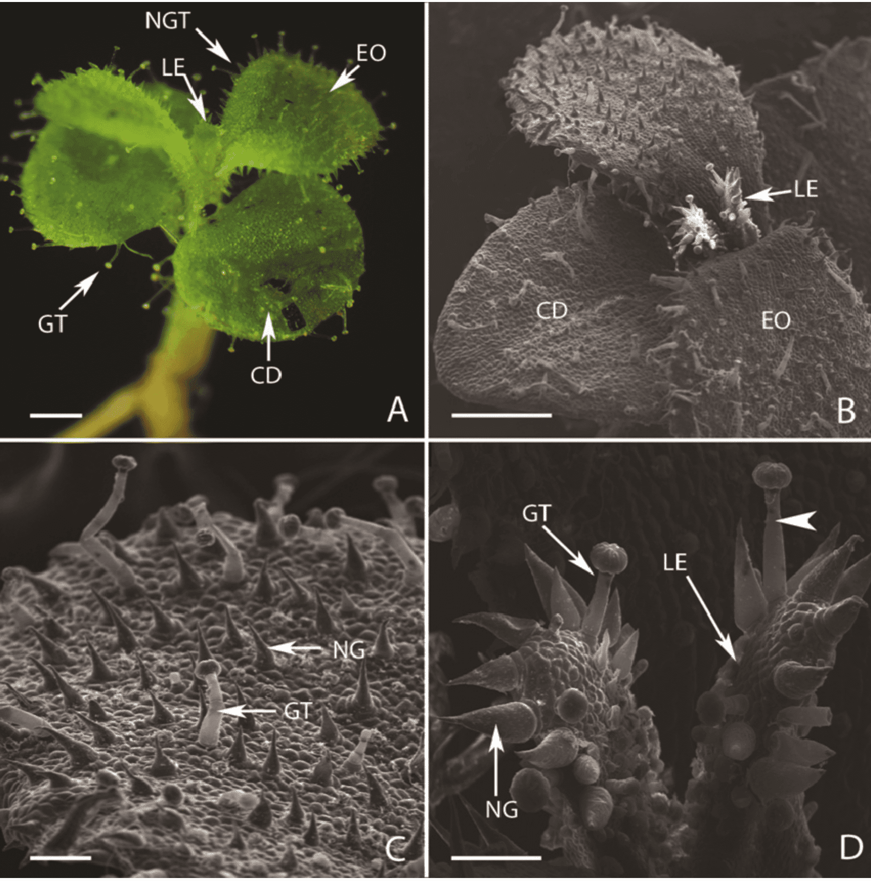 Trichomes of cotyledons, eophylls and definitive leaves of E. grandiflora present morphological features similar to the leaf trichomes of the parasitic plant Orobanche ramose L (Orobanchaceae) (Sacchetti, Ballero, Serafini, Muzzoli, & Tosi, 2003). According to the authors, O. ramose trichomes showed such chemical compounds as terpene and flavonoids. The trichomes are important for protection against pathogens and herbivorous insects (Glas et al., 2012).