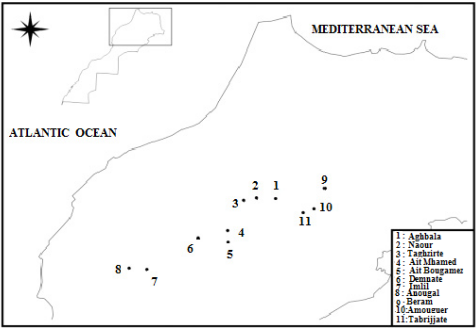 During September 2014, mature and healthy nuts were collected from 11 Moroccan walnut accessions (Table 1, Figure 1), representing its main cropping area in Morocco. From each accession, three trees were sampled on different sides. The walnut fruits were conserved in shell in dark bags. Dried nuts were shelled manually and the parameters were analyzed for each sample.