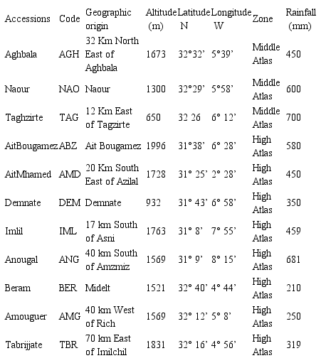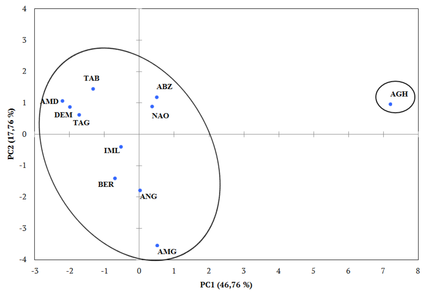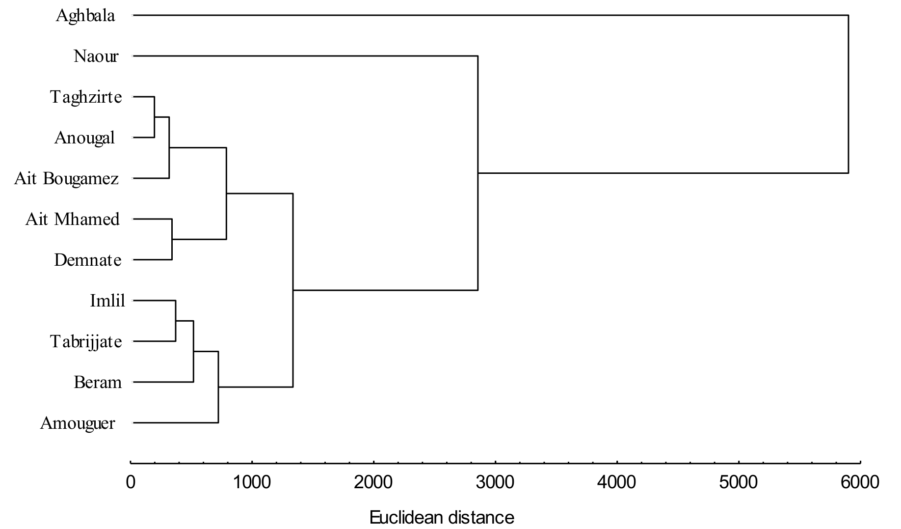 Likewise, Hierarchical cluster analysis led to identify two major groups (Figure 3). One is made of Aghbala accession originating from Middle Atlas Mountain. The other group bifurcated in two subgroups: one formed of Naour accession arising from Middle Atlas Mountain and the other one containing the rest of accessions that were partitioned also in two subgroups. A subgroup composed of Taghzirte, belonging to Middle Atlas Mountain, and Anougal, Ait Bougamez, Ait Mhamed and Demante emanating from High Atlas Mountain. The other subgroup is formed of Imlil, Tabrijjate, Amouguer and Beram coming from High Atlas Mountain.