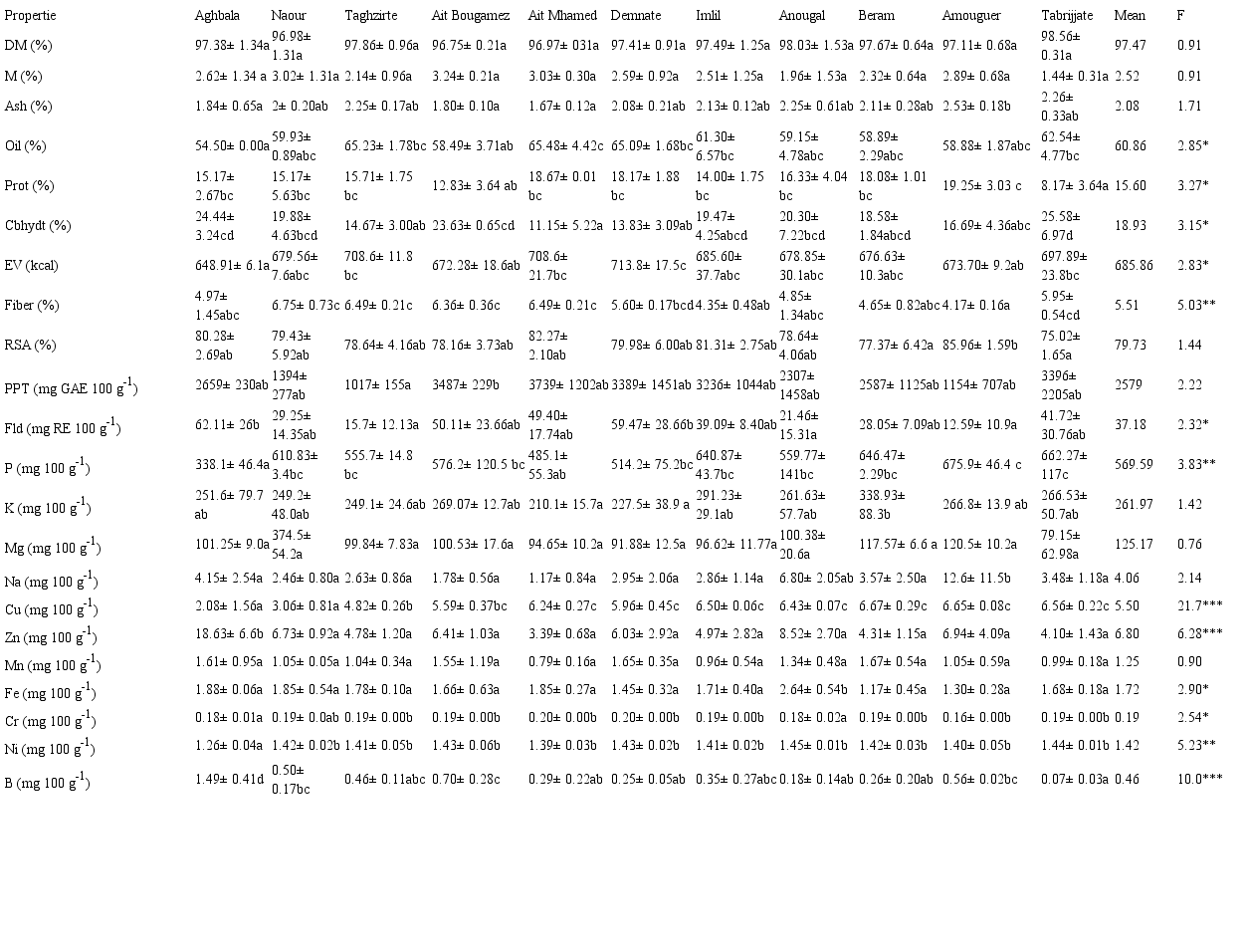 Results related to chemical composition are illustrated in Table 2. The analysis of variance exhibited significant differences between accessions for the most analyzed parameters: total oil, crude protein, carbohydrates content, energy value, crude fiber, flavonoids content and some minerals such as P, Cu, Zn, Fe, Cr, Ni and B.