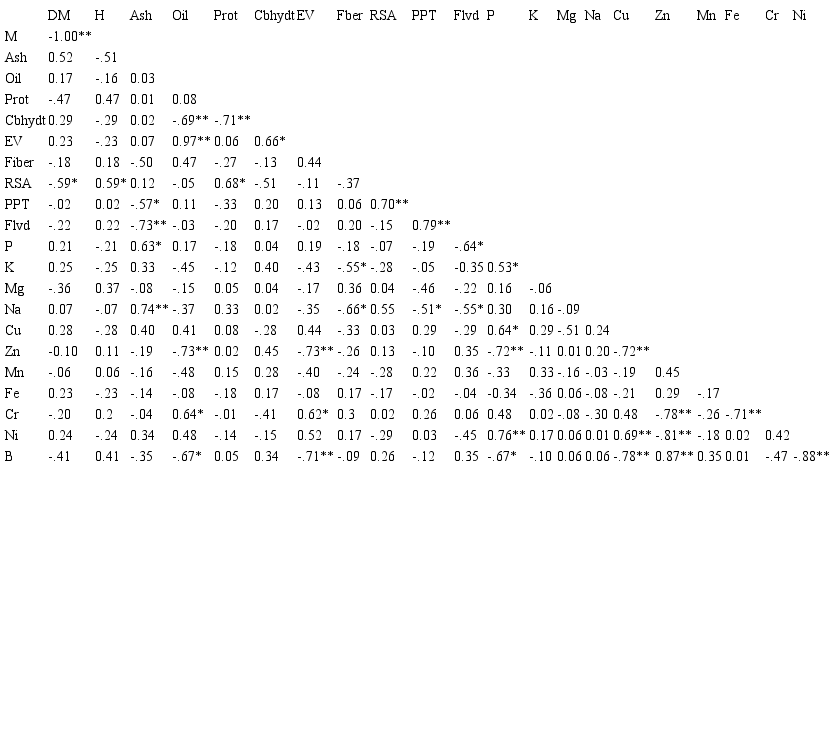 While the significant and negative correlations were indicted by the carbohydrates content with oil content (R=-0.69**) and protein content (R=-0.71**), the Zn with Cu, Cr and Ni respectively R=-0.72**, R=-0.78** and R=-0.81**. Furthermore, the B has negative correlation with Ni (R=-0.88**), Cu (R=-0.78**) and P (R=-0.67*), and the Fe with Cr (R=-0.71**).
