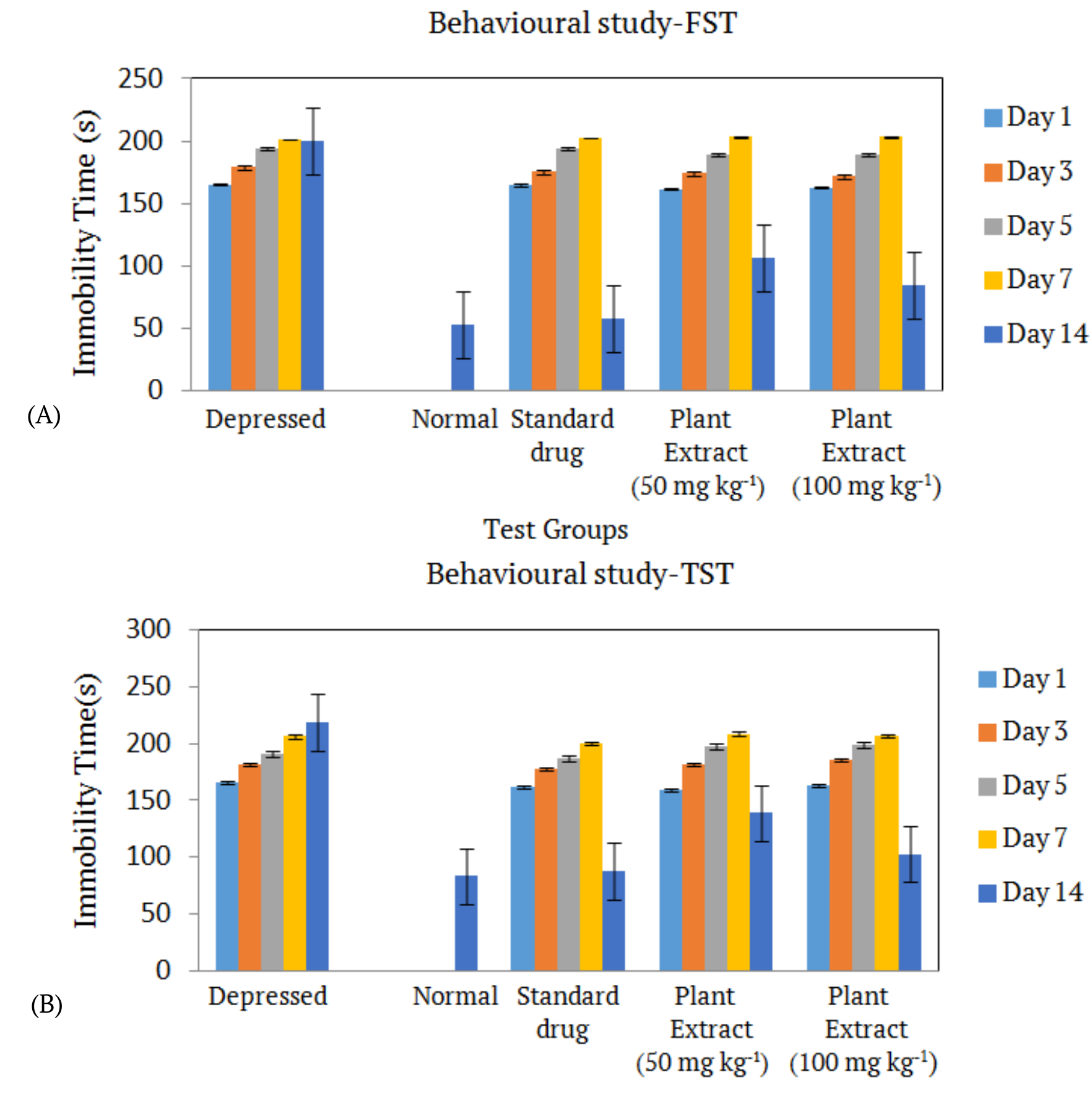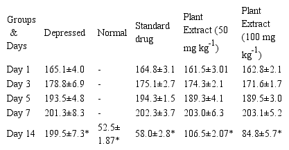 The experiment was carried out on 30 naïve adult female albino Swiss mice weighing 22–25 g. The animals were housed in the environmentally controlled rooms (temperature maintained at 24± 3°C and humidity 40–60%) in standard cages in groups of 4 as positive control (depressive without treatment), negative Control (normal) and experimental group 1 (Standard drug) and experimental group 2 (Plant extract) with unlimited access to water and food. The rooms were illuminated with a 12 hours light/dark cycle. The procedures began after acclimation period in the laboratory conditions. All procedures were conducted in accordance with the institutional ethical Committee for the Purpose of Control and Suspension of Experiments on Animals (CPCSEA) under Ministry of Animal Welfare Division, Government of India, New Delhi. The procedures and protocols were approved by the Ethics Committee at the department of animal sciences, Bharathidasan University, Tiruchirappalli (Ref No.:BDU/IAEC/2014/NE/39).
