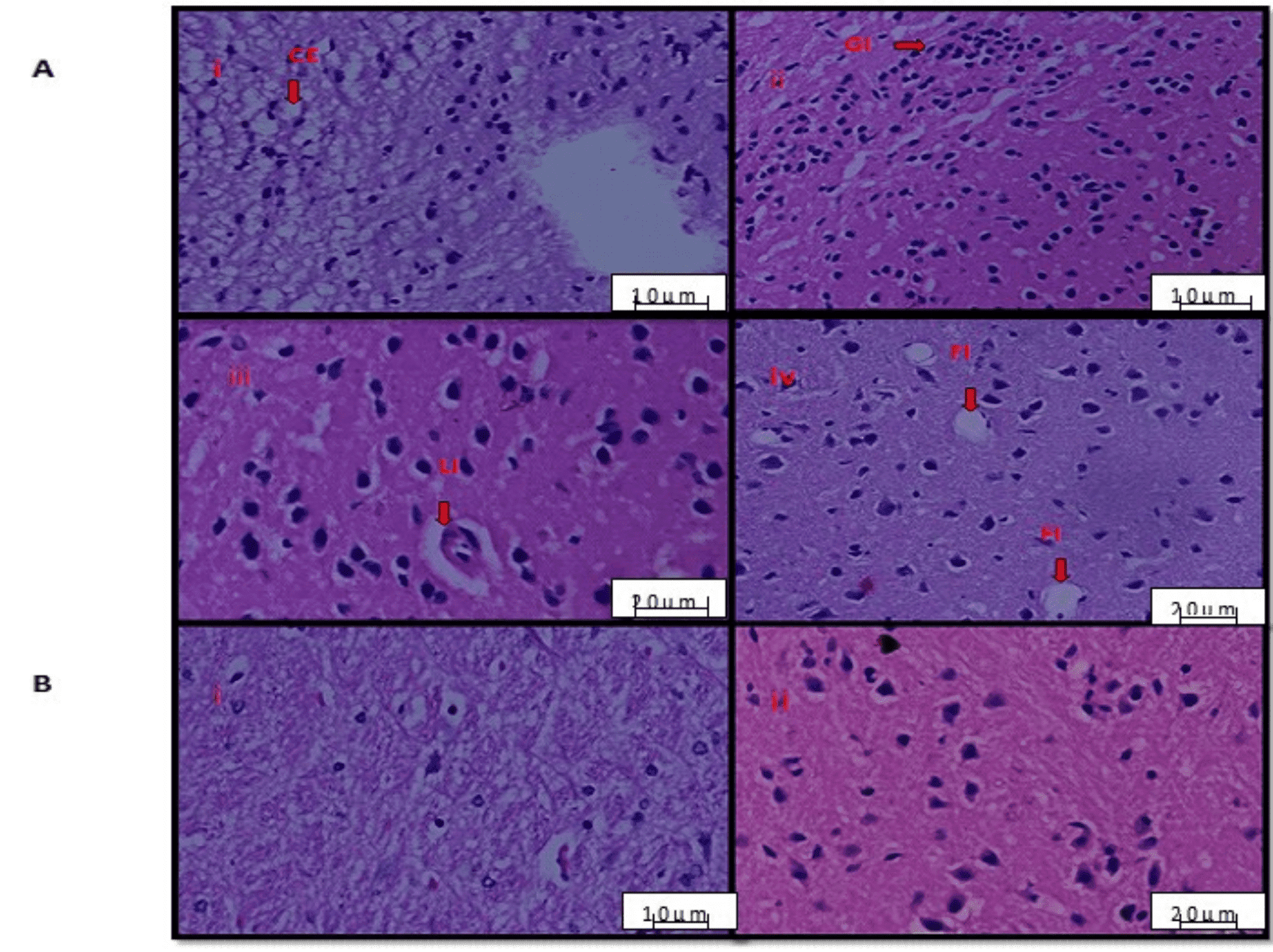 Histological studies were performed in the forebrain region (cerebral cortex) of the normal, depressed and treated animals. Figure 3A (i-iv) shows the histopathological conditions of the depressed mice such as (CE) Cellular Edema, (G) Gliosis, (LI) Lymphatic Infiltration and (FI) Fatty Infiltration. The depressed histology of the animals illustrates increase patterns of degenerative changes, gliosis, cellular edema, Fatty infiltration and infiltration in the lymphatic cells and perivascular areas. Subsequently Figure 3B (i and ii) depicts the normal mice which were not depressed and the treated mice with the plant extract. Less and mild changes are observed in the cerebral cortex regions of the treated mice with the plant extract, which exemplifies the significance of the plant Clitoria ternatea L. as an efficient brain drug that has the ability to reverse the degenerative changes, gliosis and cellular edema and can reinstates psychological illness.