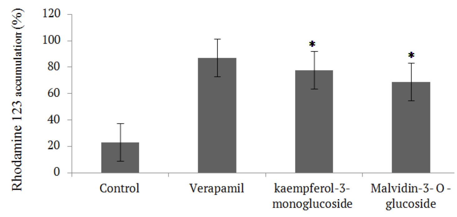 The activity of P-glycoprotein was evaluated by measuring intracellular accumulation of rhodamine 123 in hCMEC/D3. The assay was based on the inhibitory potential of the phytocompounds that estimates the polarity and release of fluorescent dye rhodamine 123, which is a substrate of P-gp (Haseloff, Blasig, Bauer, & Bauer, 2005). Cells were incubated at 37ºC with 5.25 µM rhodamine 123 for 30 min., in the presence or absence of various concentrations of P-gp inhibitors (Kaempferol-3-monoglucoside, Malvidin-3- O –glucoside 10mg ml-1 and with standard P-gp Inhibitor Verapamil (50µM) as a positive control. After washing in phosphate-buffered saline, cells were lysed in distilled water, and intracellular levels of rhodamine 123 were by fluorescence microplate reader. (BioTek, USA; excitation wavelength at 485, emission wavelength at 538 nm). Data were expressed as % of rhodamine 123 accumulation in control cells not exposed to P-gp inhibitors, arbitrarily set at 100%.