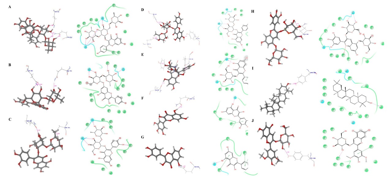Contemporary research emphasizes on active compounds that targets specific ailments. Though the antidepressant competence of Clitoria ternatea L. is renown there is a need to identify the phytocompounds that can fortify it as a brain drug to contest the blood brain barrier. Therefore docking studies were performed with ten bioactive molecules against the molecular target (P-gp) based on their corresponding co-crystallized ligands available in their 3D-structures. The binding interactions of the protein- ligand complexes are shown in the Figure 4(A-J) with their interaction details listed in Table 3. The phytocompound (Clitorin) kaempferol 3-O-(2'', 6’’-di-O-rhamnopyranosyl) glucopyranoside (Figure 4A) provided least docking score of -12.574 kcal mol-1 and interacted with an active site residue Gln721. This was pursued by (Figure 4B) kaempferol-3-rutinoside (-11.288 kcal mol-1) with an interacting aminoacid residue Gln986, Gln721 and Tyr306.