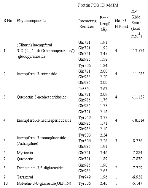 In silico molecular docking of ten imperative phytocompounds of Clitoria ternatea L. against the targeted protein P-gp was carried out using Glide software (Schrodinger Inc. U S A- Maestro version 10.2) (Friesner et al., 2006). The crystallographic coordinates for target protein P-Glycoprotein was retrieved from the Protein Data Bank (PDB ID 4M1M). The data set of compounds were taken from literature reported by (Tiwari & Gupta, 1959; Ripperger, 1978). The 3D structures of the phytocompounds considered as ligands were retrieved and downloaded as .mol files from the site of PubChem database.