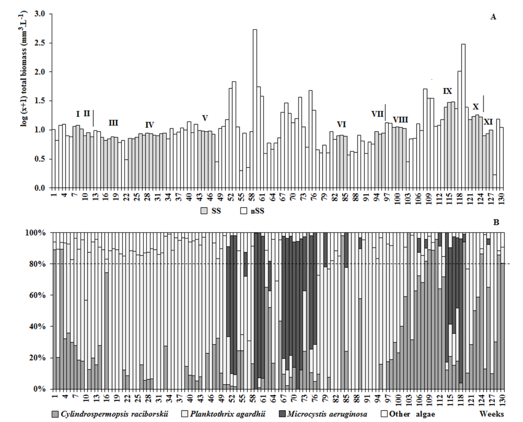 Of the SS periods observed, three had P. agardhii as the only species with biomass above 80% total biomass (IV, V and VII). In seven periods, two species amounted to 80% total biomass (P. agardhii and C. raciborskii), showing dominance of P. agardhii (I, II, III and VIII), dominance of C. raciborskii (X and XI) and co-dominance of these species (VI). In period IX, three species together amounted to 80% total biomass (P. agardhii, C. raciborskii and M. aeruginosa), with dominance of the colonial species (Figure 1B). Periods of heavy rainfall coincided with steady state of only P. agardhii, while, in other periods, the average volume of rainfall were lower (Table 1).