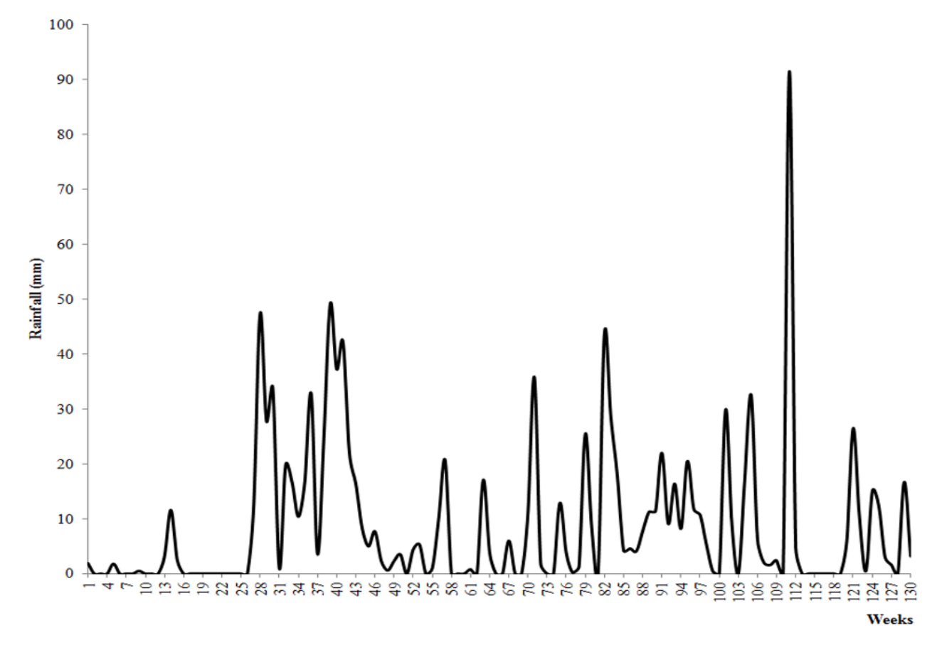 There was no correlation between rainfall and SS occurrence (S=1759, RHO=-0.14, p > 0.05). Then, SS events occurred both in drier and rainy periods (Figure 2). The SS length varied between 3 and 11 weeks (mean = 4.3 ± 2.4 weeks), and there was no significant difference in the duration between the drier and rainy periods (T = 1.1, p > 0.05). SS events were alternated with nSS periods, that lasted, on average, 8.4 ± 10.2 weeks.