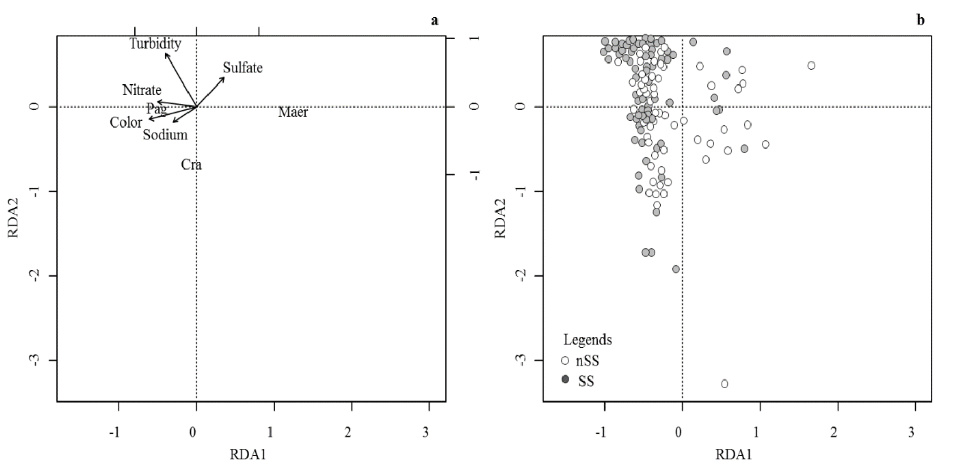 Figure 3 illustrates the RDA with all 130 samples analyzed, where it is possible to observe the relationship between environment variables and the species with at least one steady state event during the study (P. agardhii, C. raciborskii and M. aeruginosa). Eigenvalues of axes 1 and 2 explained 26.4% variation of biological data, of which 80% on the axis 1 and 17% on the axis 2. Both axes were significant to explain the relationship between abiotic and biotic variables (p = 0.005). The sampling units that showed SS were negatively correlated with the axis 1. The nSS samples showed heterogeneous distribution with respect to this axis. The variables sodium (-0.38), nitrate (-0.62) and color (-0.77) were negatively correlated with axis 1, while sulfate (0.44) showed a direct correlation. Greater concentrations of nitrate and sodium and higher values of color and turbidity favored the development of SS periods dominated by P. agardhii. M. aeruginosa was correlated to the nSS periods and was favored by higher sulfate concentrations. Finally, C. raciborskii species showed no correlation with nSS or SS periods, maintaining high biomasses throughout the study period, but not necessarily reaching a steady state.
