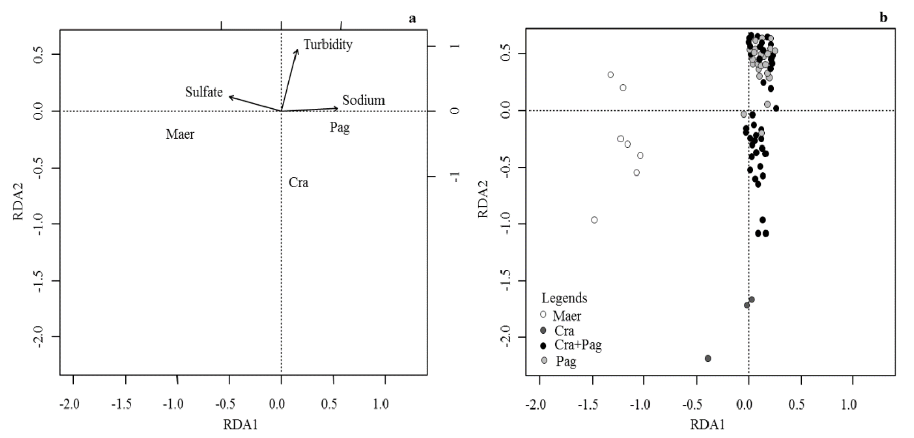 Detrended Correspondence Analysis (DCA) was run using the biotic matrix to choose the best multivariate analysis to evaluate the influence of abiotic variables on the biotic variables. The length of the first DCA axis < 3 S.D. indicated homogeneous dataset for which linear methods (Redundancy Analysis - RDA) are suitable.