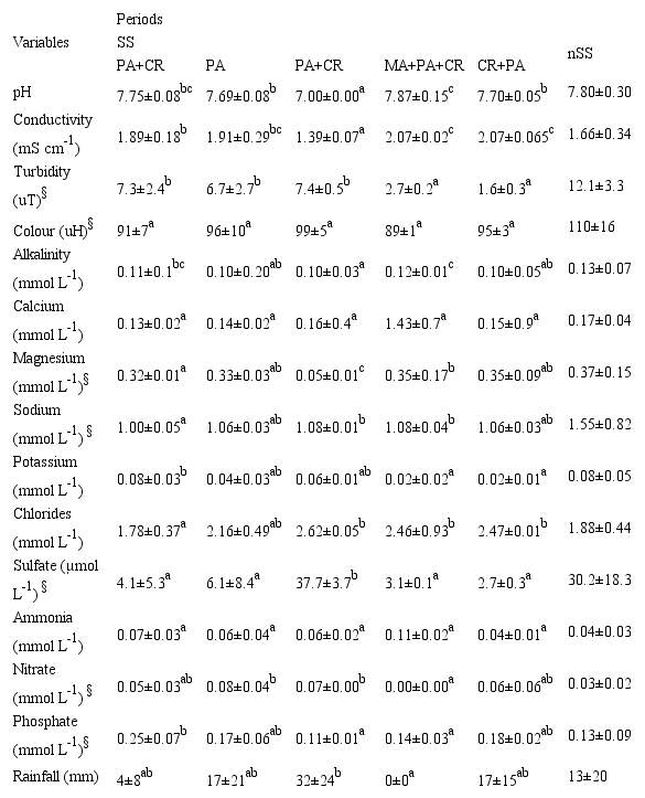 Nitrate and color were variables related to SS periods, however oscillations in their values were not significant to distinguish these periods as the SS dominant species. For this, turbidity, as well as the concentrations of sulfate and sodium, were suitable.