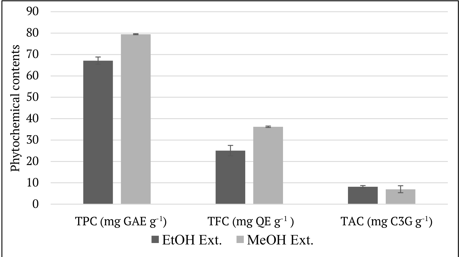 Both of the plant extracts had higher total phenolic content, but the T. algeriensis methanol extract had significantly (p < 0.05) higher TPC than its ethanol extract, the TPC was 79.45 and 67.13 mg GAE g-1 dry weight. TFC and TAC recorded for ethanol extract were 25.04 (mg QE g-1) 8.14 (mg C3G g-1), respectively. Conversely, they were 36.18 (mg QE g-1) and 6.98 (mg C3G g-1) methanol extract.