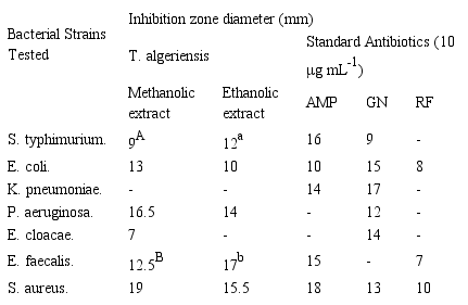 The results indicated that both methanolic and ethanolic extracts of T. algeriensis displayed strong antibacterial ability against the most pathogenic strains tested. It can, therefore, be inferred that those extracts could be useful as a natural antibacterial agents.