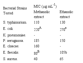 Ethanolic flower extract of some studied Uruguayan medicinal plants has presented high antibacterial activity against: E. coli, P. aeruginosa, S. aureus, B. subtilis. (Alonso-Paz et al., 1995). Methanol extract of Rhus glabra, a species used in folk medicine by North American native people, prevents the growth of E. coli, P. aeruginosa, S. aureus; for which MICs were 400, 100 and 100 μg mL-1, respectively (Saxena, McCutcheon, Farmer, Towers, & Hancock, 1994).