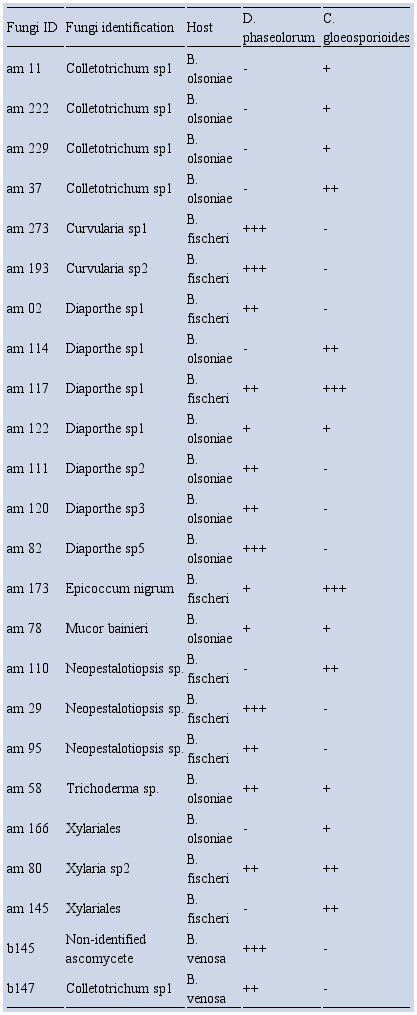 The bioassays against the plant pathogens D. phaseolorum and C. gloeosporioides were carried out with the ethyl acetate extracts obtained from 88 endophytic fungi, being 36 from B. fischeri, 24 from B. olsoniae and 28 from B. venosa. From the 88 fractions evaluated, 14.7% were active against C. gloeosporioides, 11.3% against D. phaseolorum and 6.81% inhibited both plant pathogens, varying in inhibition indexes. In relation to the host plants, 27.7% of the selected endophytes from B. fischeri inhibited the growth of at least one of the plant pathogens evaluated, against 50% of B. olsoniae endophytes and 7.14% of B. venosa (D. phaseolorum inhibition only). The 24 active fractions were reevaluated in a new bioassay (in triplicate). The results are shown in Table 1.