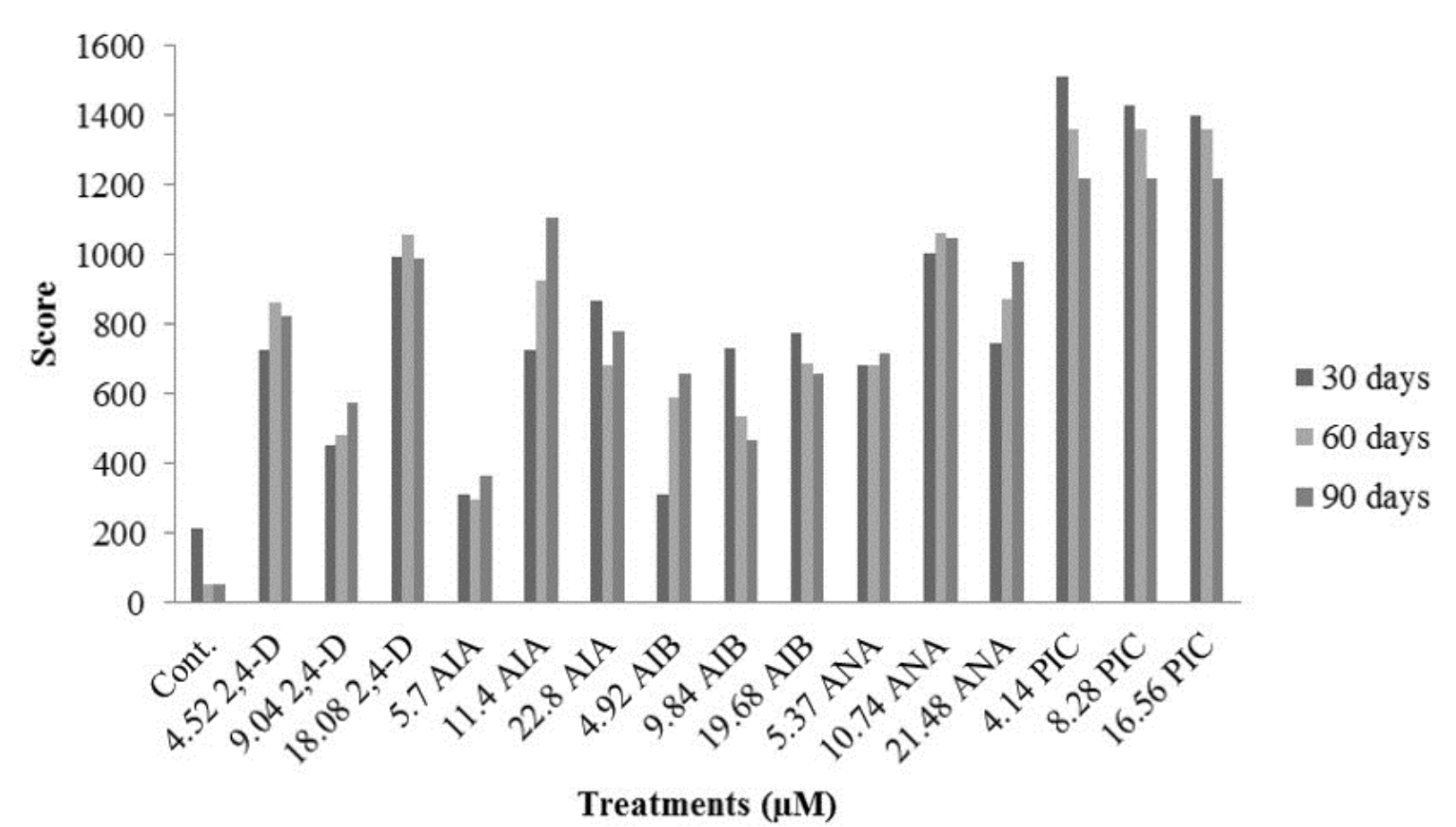 The presence of calli was observed in all treatments containing 2,4-D, IAA, IBA, NAA and picloram (Figure 1). The use of 4.14 µM picloran showed the best results for callus induction from nodal segments since it was possible to obtain calluses on 100% of the explant at 30 days. Doses of 8.28 and 16.56 μM picloram had similar results, but were only able to obtain 100% callus formation after 60 days, at the point oxidation began to be observed.